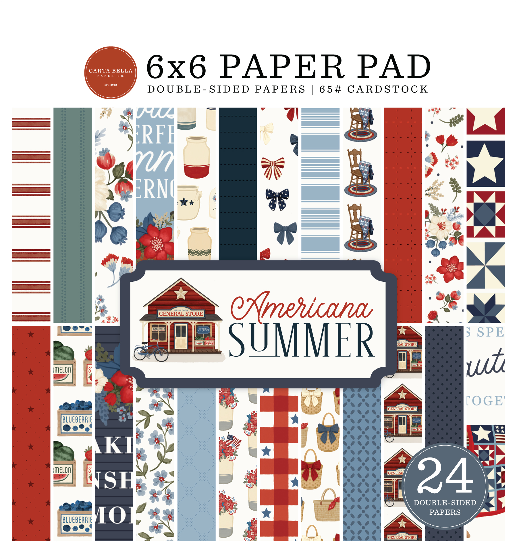 This 6" x 6" Paper Pad includes 24 double sided papers that feature unique designs on each side. All patterns and elements have been scaled down making them perfect for cardmaking or similar applications. All of our Carta Bella paper pad products are both acid free and lignin free, printed on 65 lb accent opaque cardstock, and made in the USA.