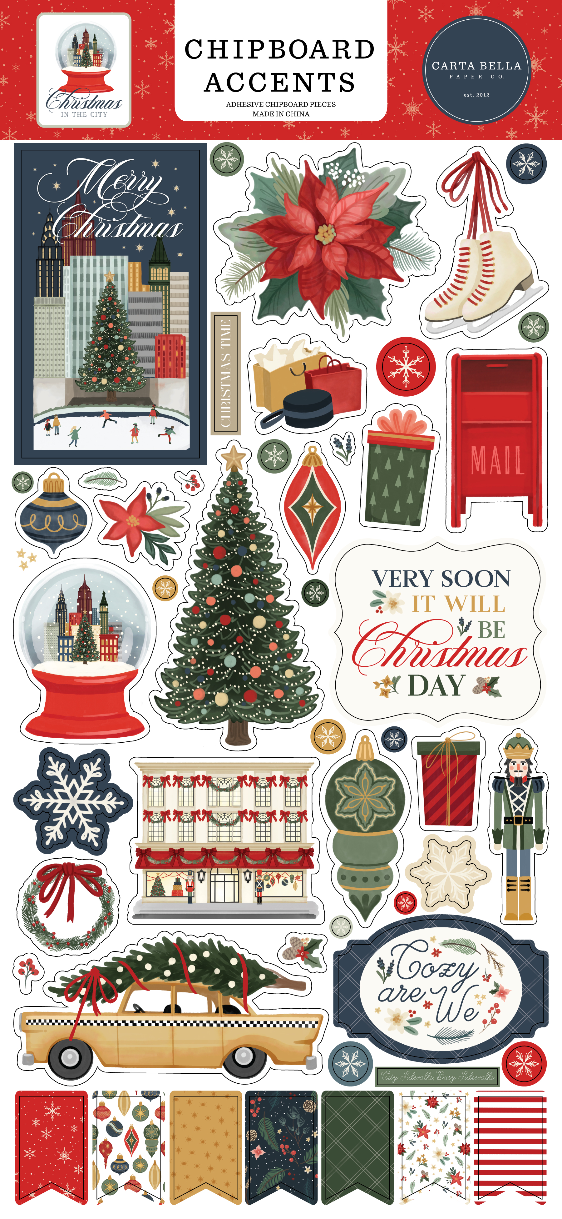 Our 6" x 13" board of Chipboard Accents feature vibrant designs and some of our favorite elements from our Christmas in the City collection.