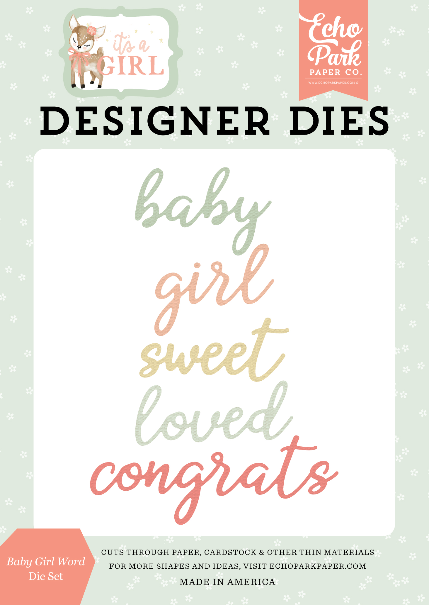 Baby Word measures 1.5"x1". Girl Word measures 1.3"x1". Sweet Word measures 1.7"X.7". Loved Word measures 1.8"x.75". Congrats Word measures 2.8”x1". Designer Dies from Echo Park cut through paper, cardstock, other thin materials and are compatible with most manual die cut machines.