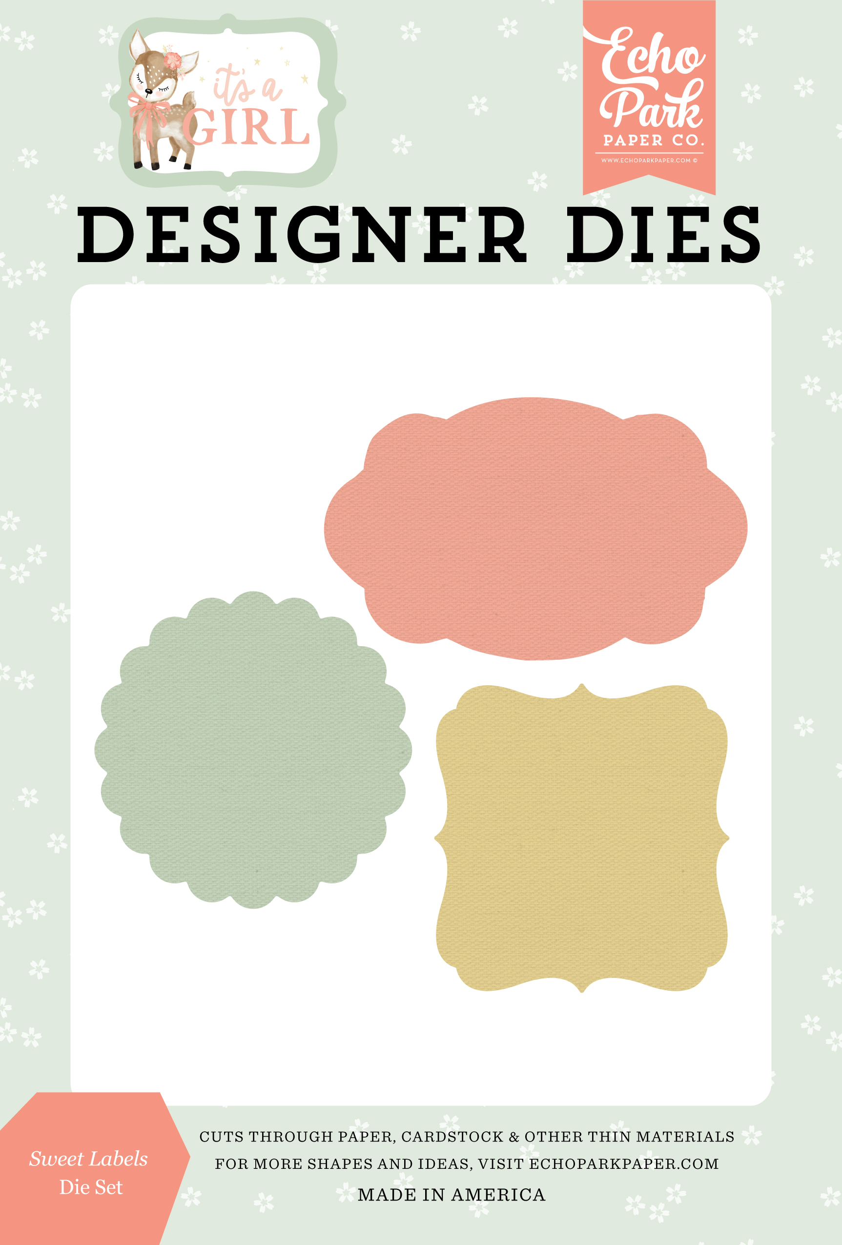 Scallop Circle measures 2.2"x2.2". Horizontal Label measures 2.9"x1.8". Third label meausres 2”x2.1". Designer Dies from Echo Park cut through paper, cardstock, other thin materials and are compatible with most manual die cut machines.