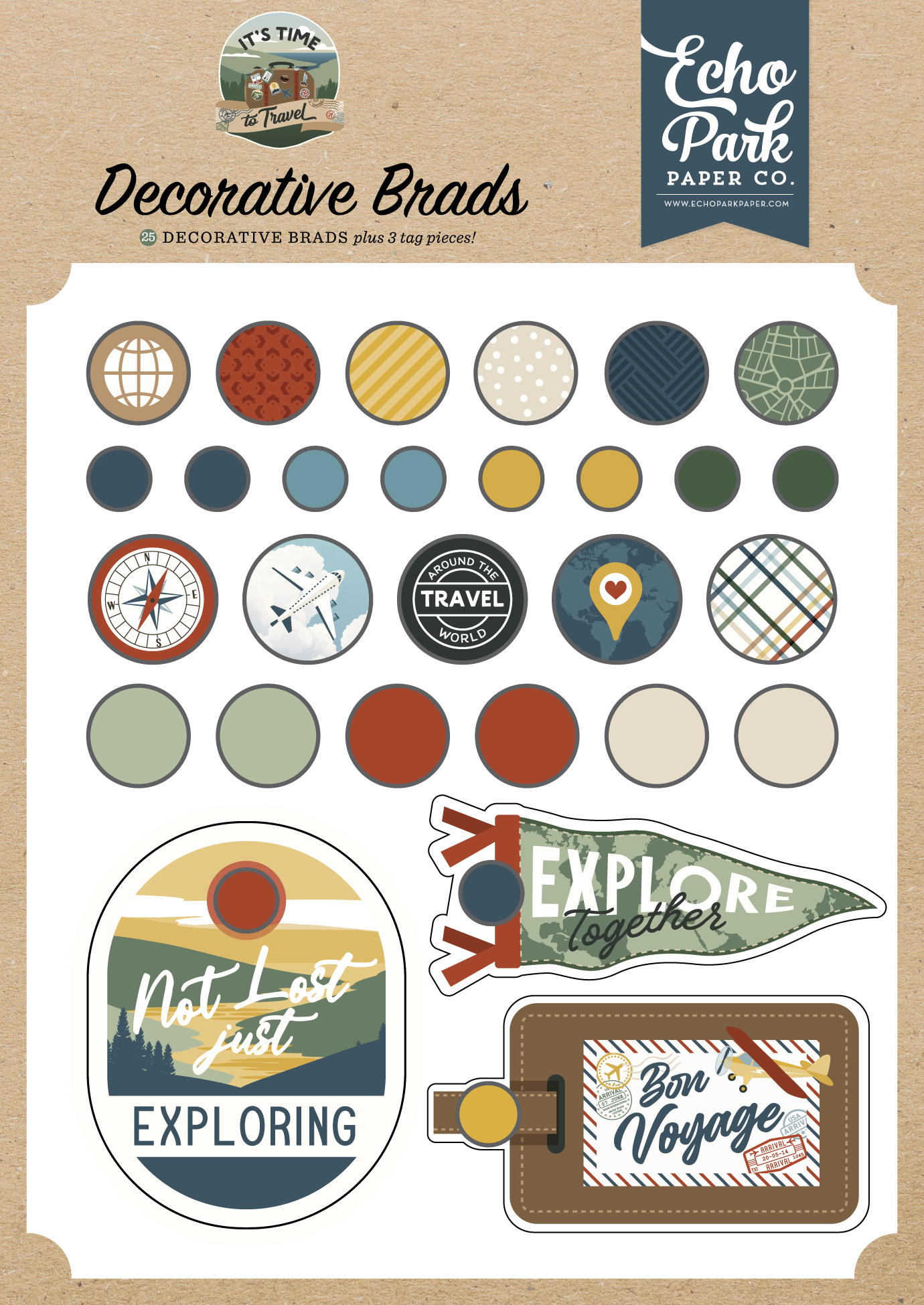Our adhesive brads include a selection of metal and enamel brads with chipboard elements featuring designs from our It's Time To Travel collection. Both the brads and chipboard pieces have adhesive backs making them easy to use on your next project, card, or craft.
