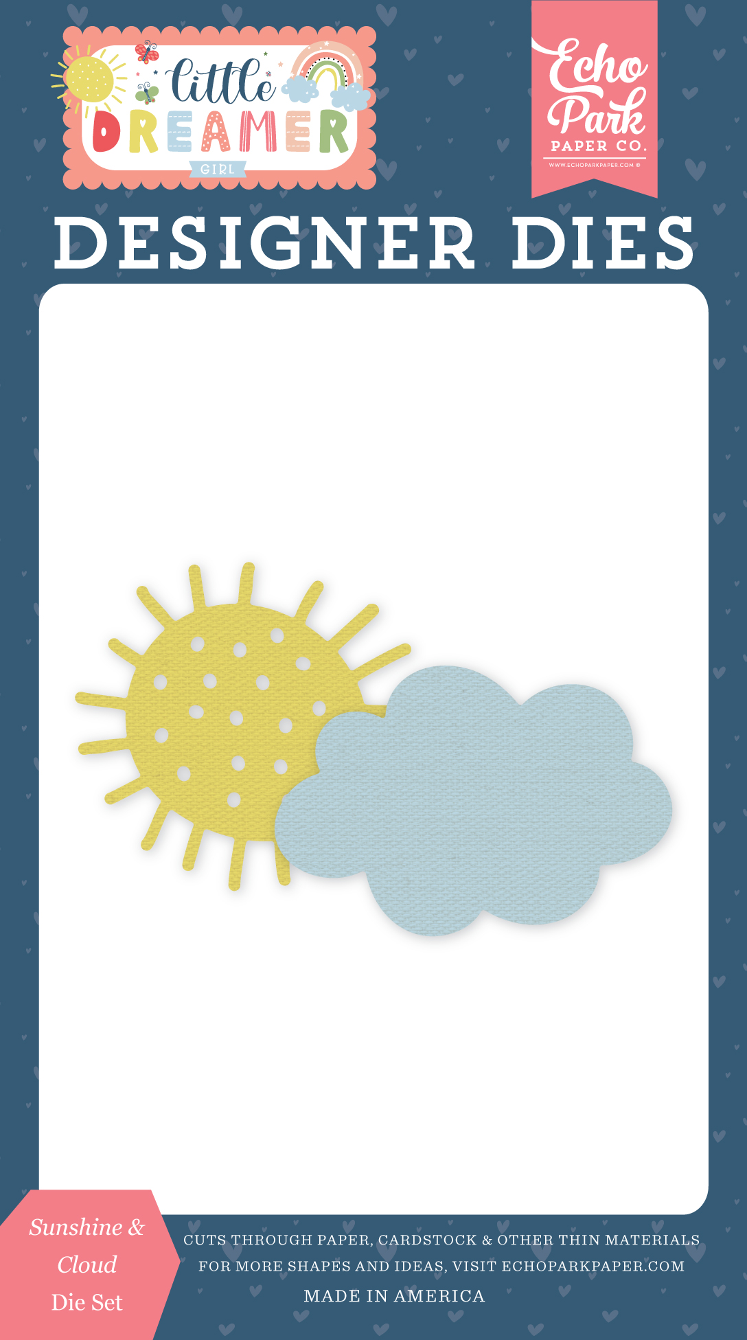 Sun measures 1.5" x 1.5", Cloud measures 1.25" x 2”. Designer Dies from Echo Park cut through paper, cardstock, other thin materials and are compatible with most manual die cut machines.