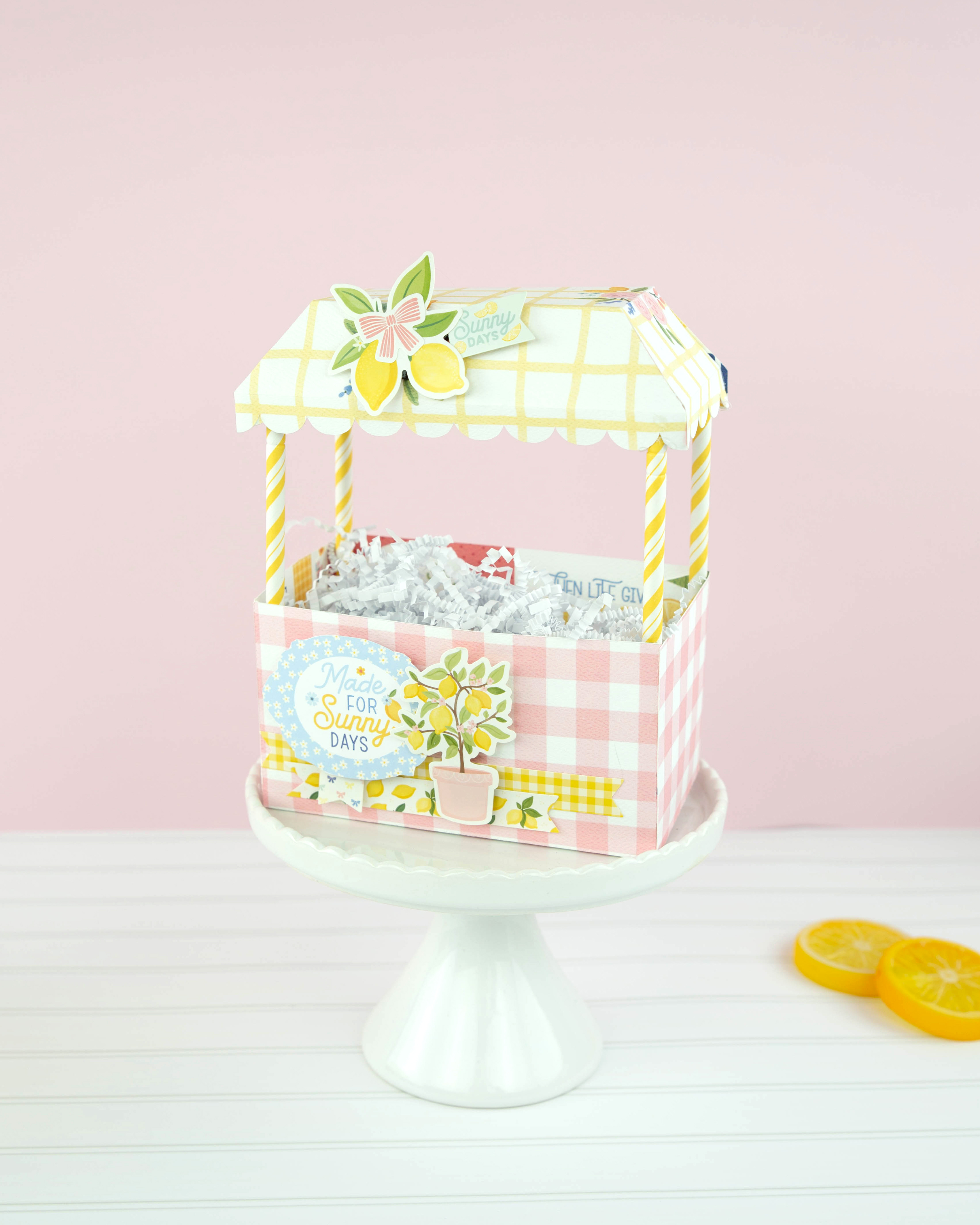 Setting up the most adorable lemonade stand you've ever seen! This 3D paper stand doubles as the sweetest gift basket — just add paper shred, a little treat, and let the summer fun begin!