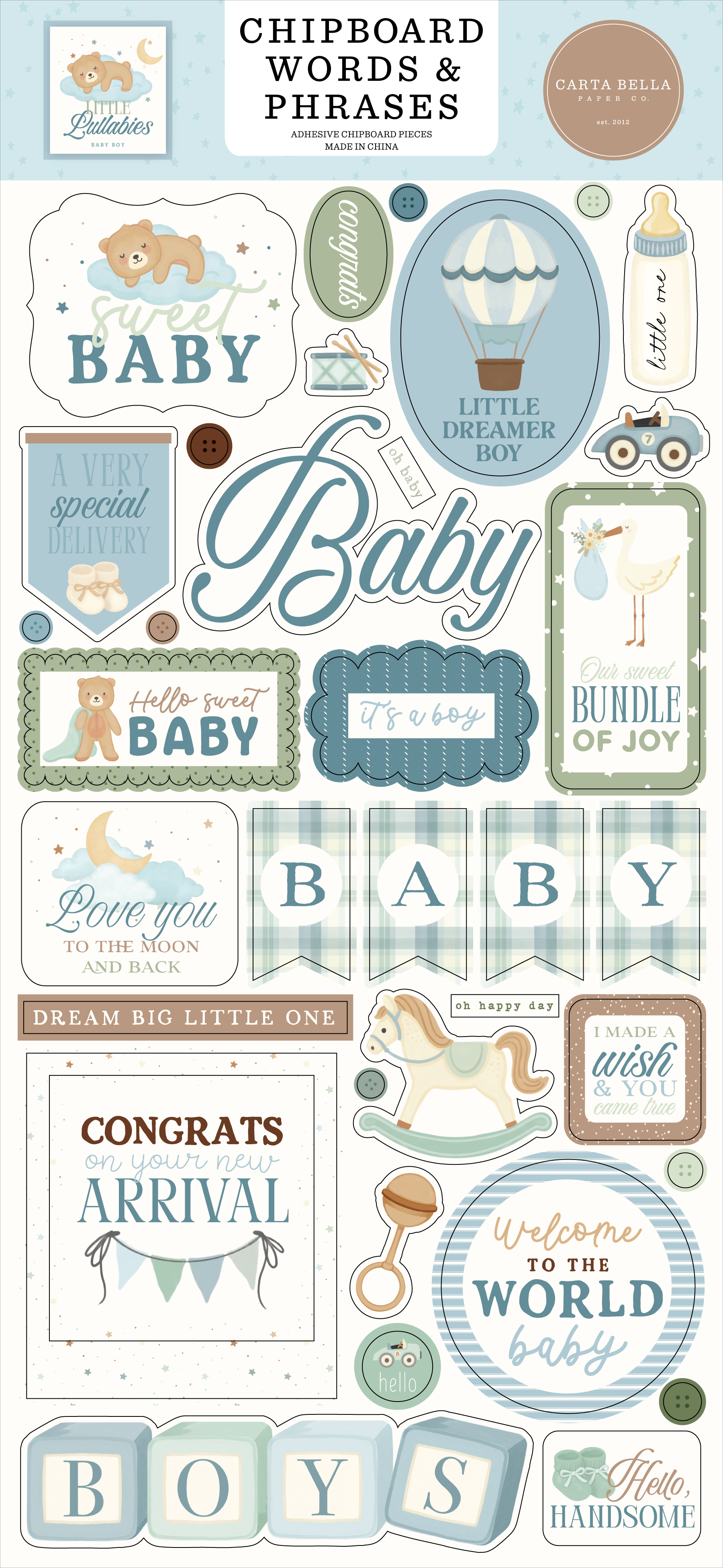 Our 6" x 13" board of Chipboard Phrases feature vibrant designs and some of our favorite phrases from our Little Lullabies - Baby Boy collection.