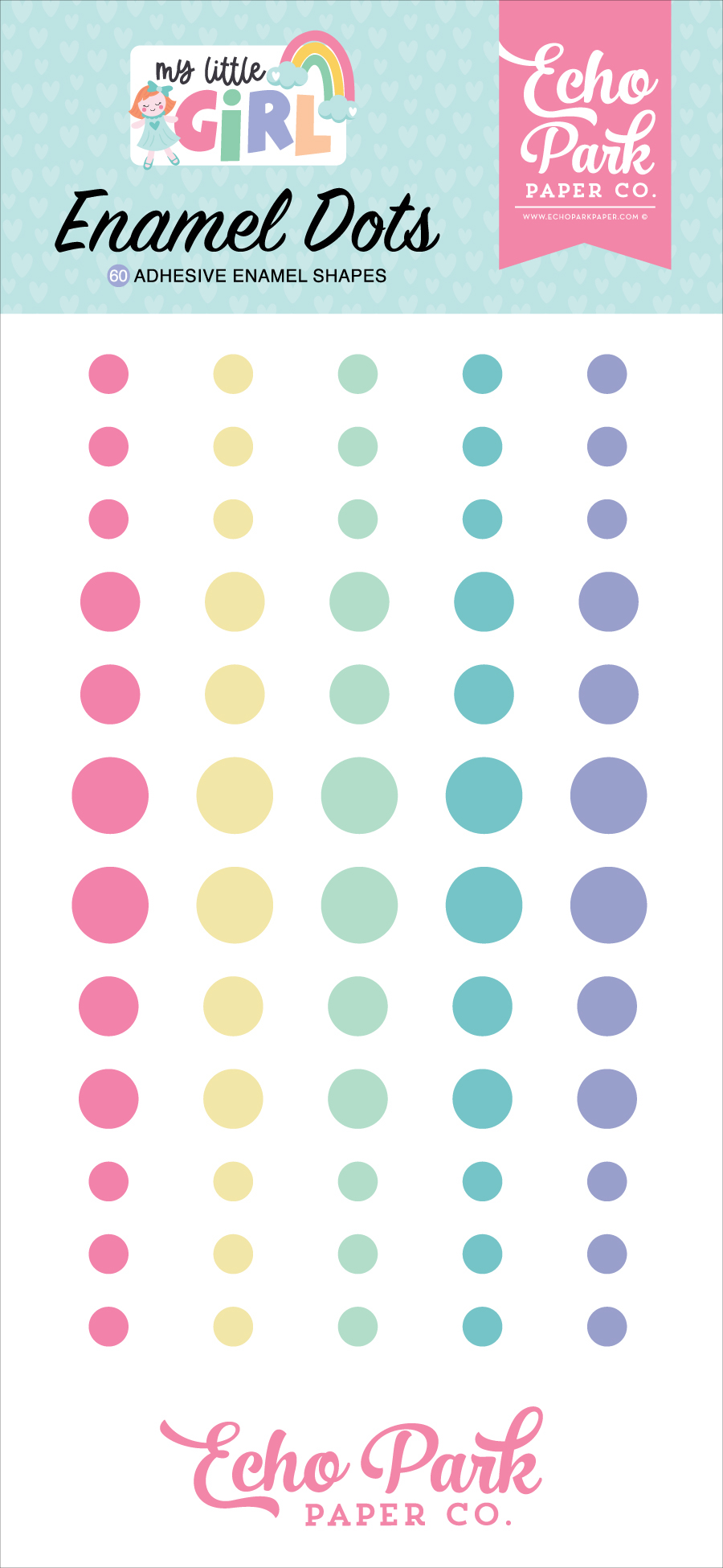 These adhesive enamel dots include 60 dots per package that come in five different colors and in three different sizes.