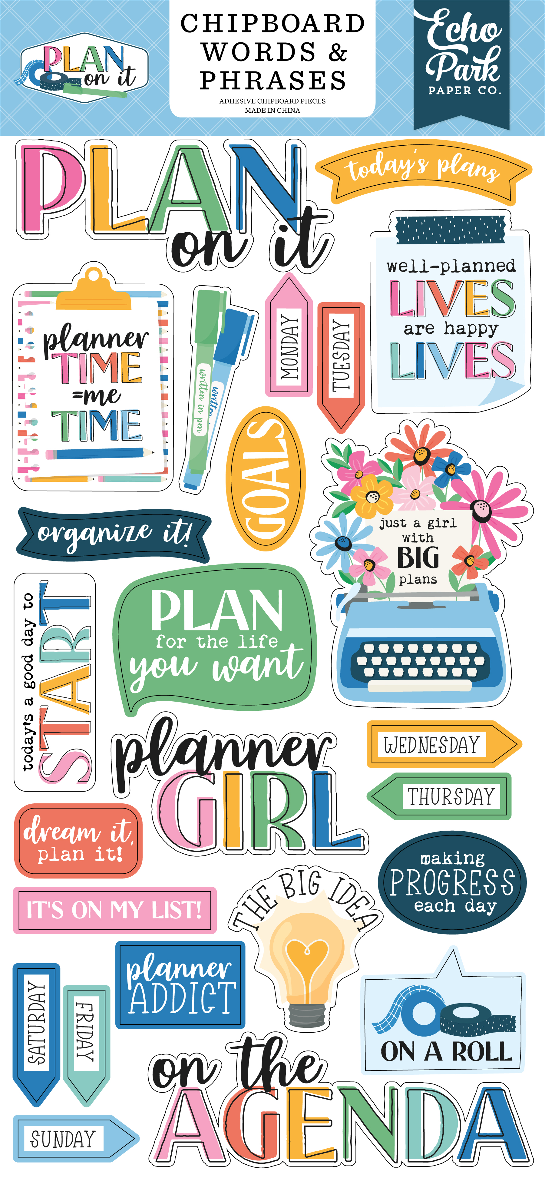 Our 6" x 13" board of Chipboard Phrases feature vibrant designs and some of our favorite phrases from our Plan On It collection.