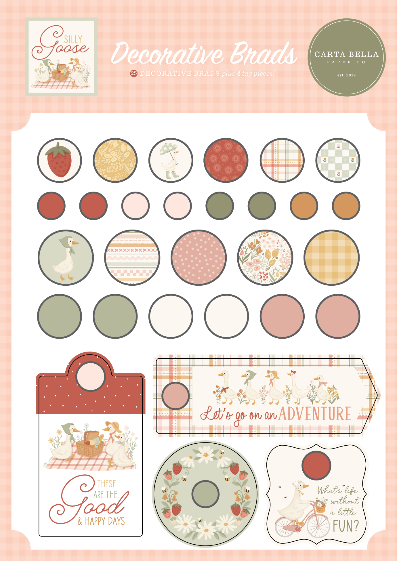 Our adhesive brads include a selection of metal and enamel brads with chipboard elements featuring designs from our Silly Goose collection. Both the brads and chipboard pieces have adhesive backs making them easy to use on your next project, card, or craft.