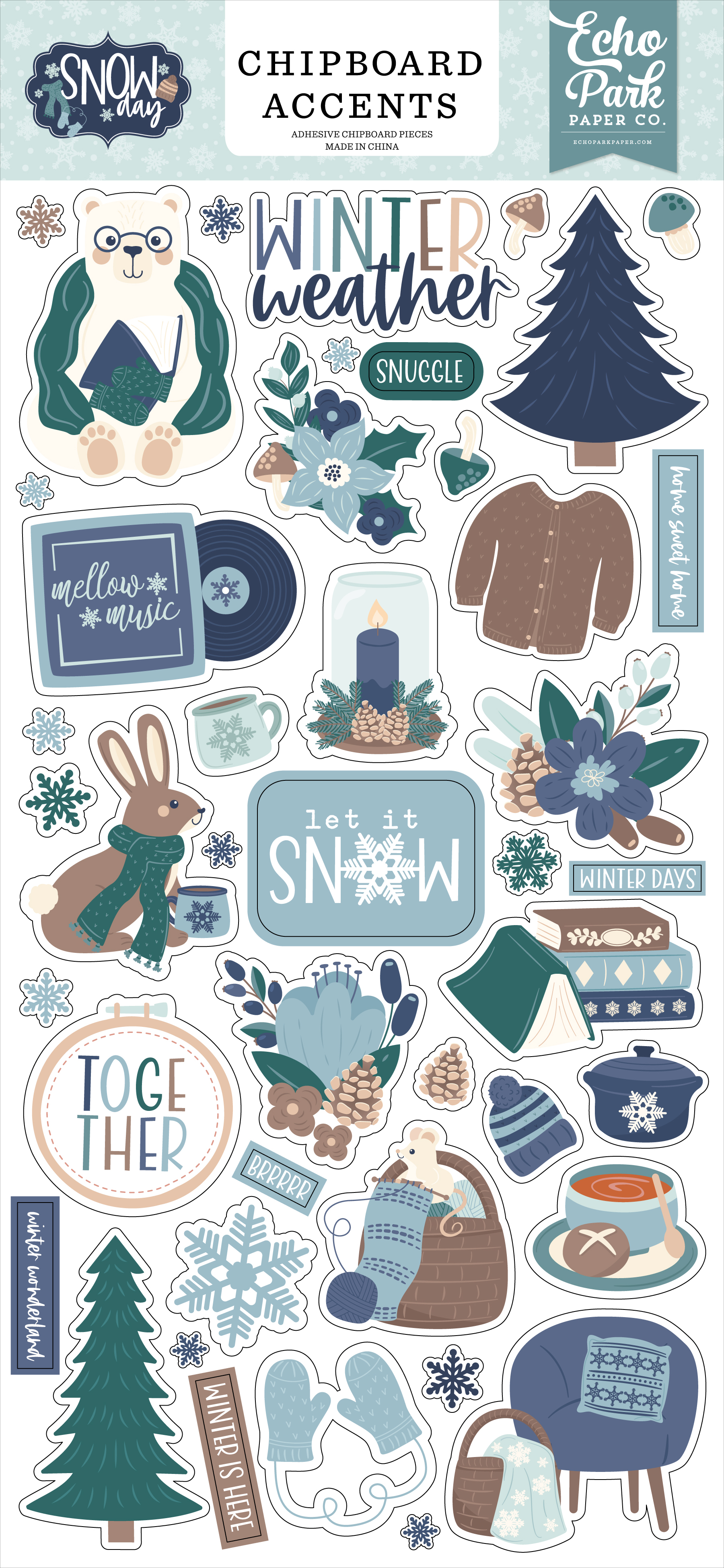 Our 6" x 13" board of Chipboard Accents feature vibrant designs and some of our favorite elements from our Snow Day collection.