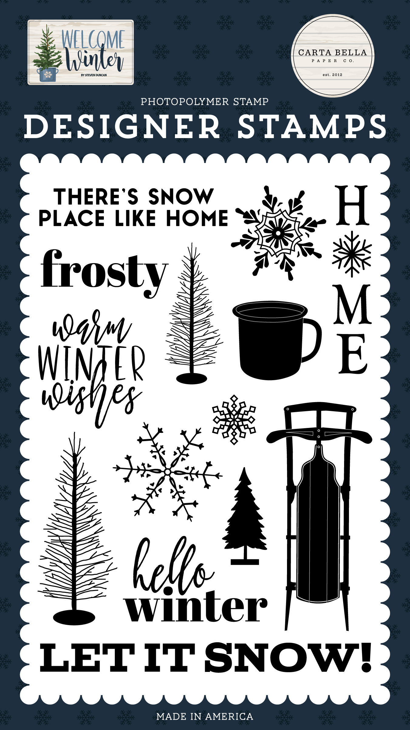 4" x 6" Photopolymer Stamp Set includes 13 Stamps. For use with acrylic stamping blocks and stamping ink.