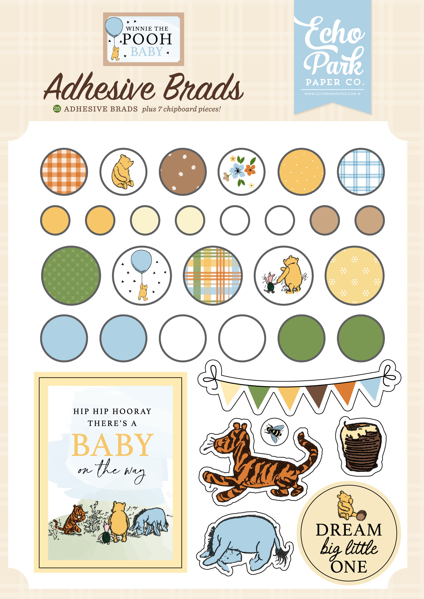 Our adhesive brads include a selection of metal and enamel brads with chipboard elements featuring designs from our collection. Both the brads and chipboard pieces have adhesive backs making them easy to use on your next project, card, or craft.